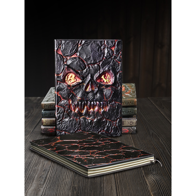 Записная книжка с твердой обложкой с изображением каменного черепа, через жилы которого пробивается лава, - отличный вариант для любителей