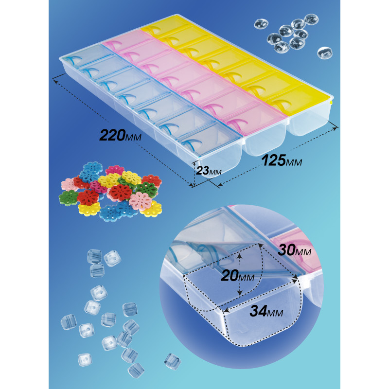 Размер органайзера: 22 * 12,5 * 2,3 см. Размер ячеек: 3,4 * 3 * 2 см. Количество