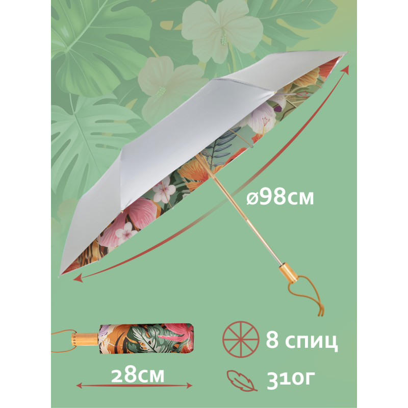Зонт имеет компактные размеры, в сложенном виде 28 см, легко помещается в сумку, что делает его идеальным спутником на каждый день.