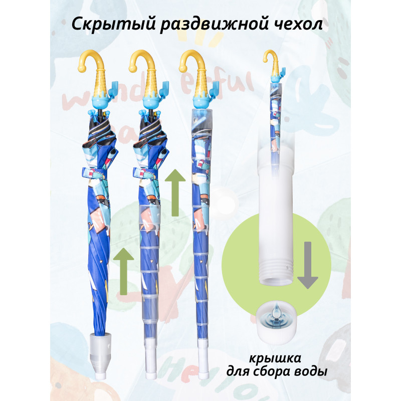 Детский зонт с ярким рисунком – идеальный выбор для маленьких героев, которые не боятся погодных сюрпризов Закрывается зонтик вручную, а открывается при помощи кнопки. Нет нужны прикладывать большую силу - плавный механизм обеспечивает мягкое и легкое раскрытие купола.