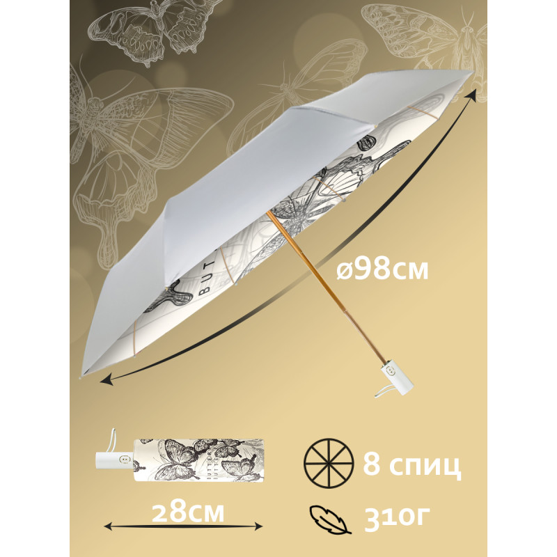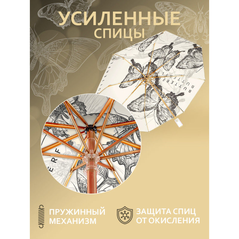 Одно из главных преимуществ этого зонта – его двусторонний дизайн с принтом порхающих бабочек. Черные и белые оттенки