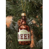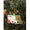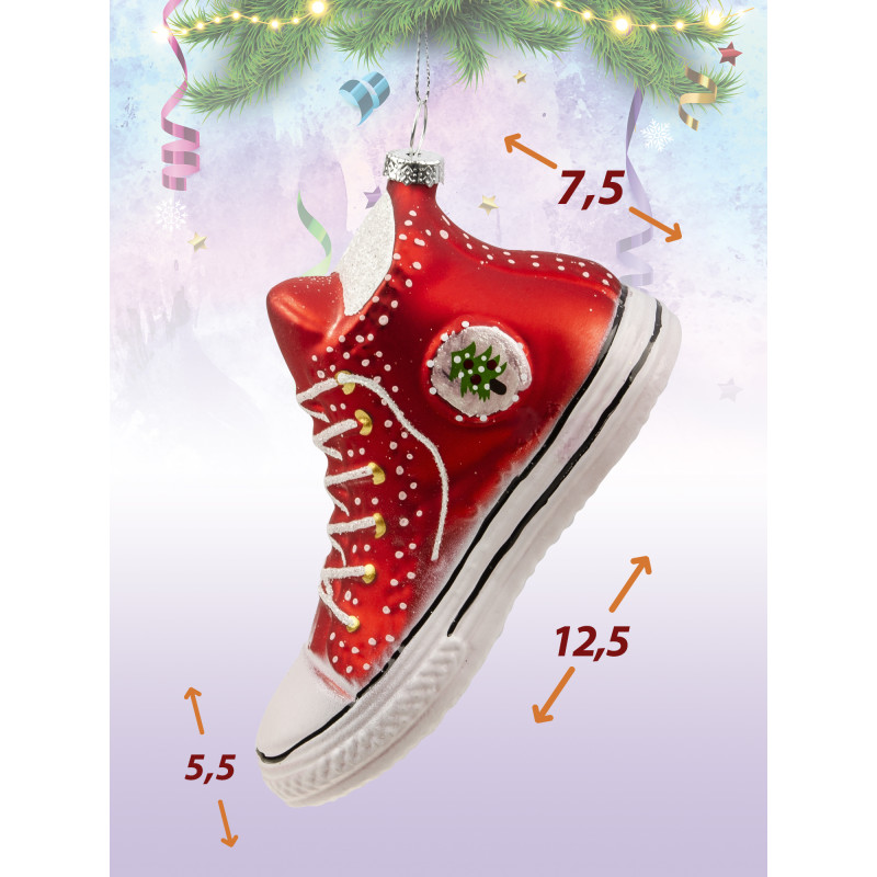 В наборе собраны елочные игрушки в форме красного кеда с эмблемой, фургончика доставки пиццы, бутылочки с темным. Они