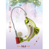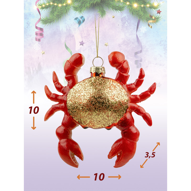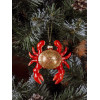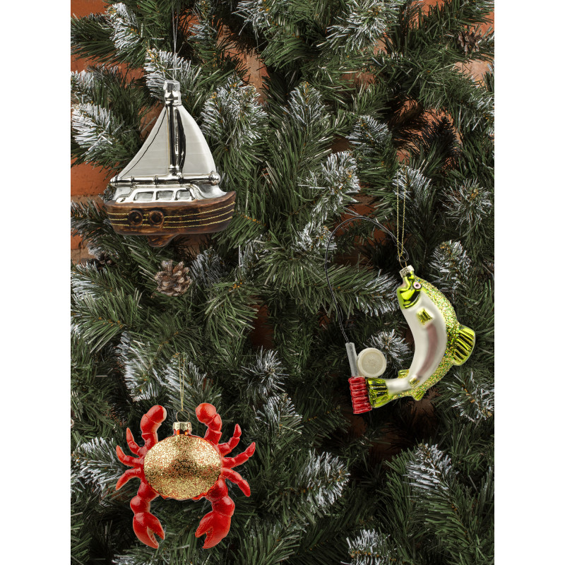 В наборе собраны елочные игрушки в форме парусника с коричневой кормой и серебристыми парусами, крабика с красными клешнями и стеклянным золотым тельцем, бело-зеленой рыбки, пойманной на крючок. Они