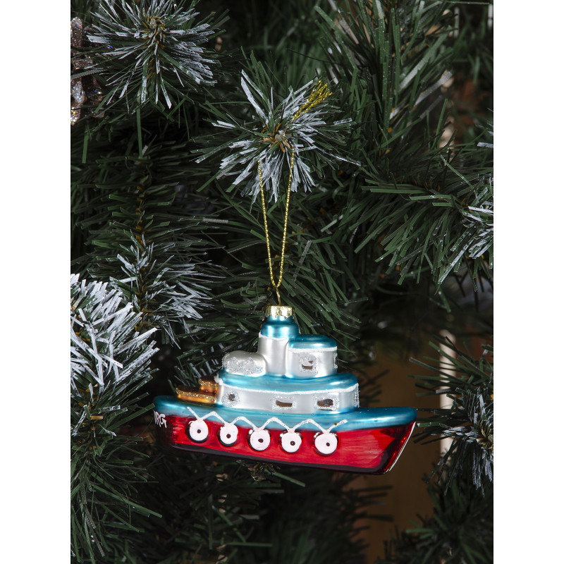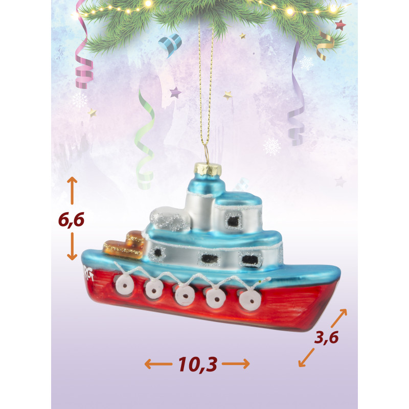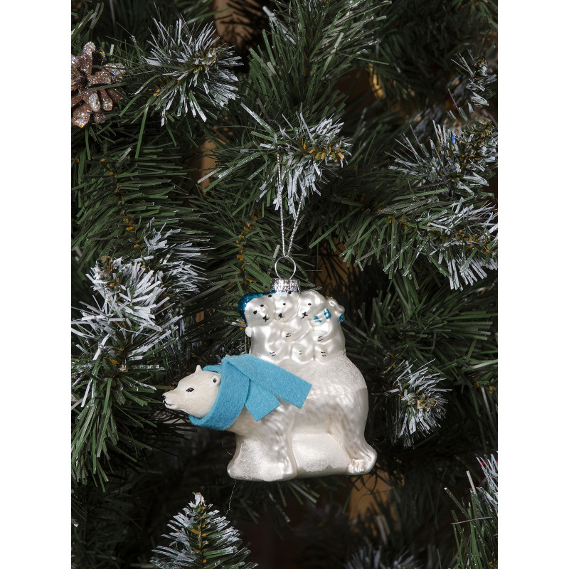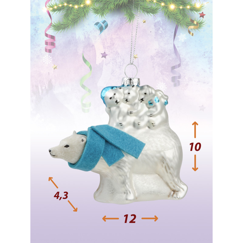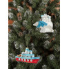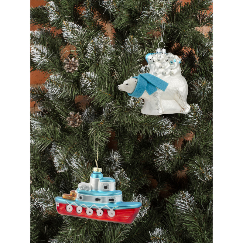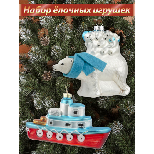 В наборе собраны елочные игрушки в форме медвежьей семьи и парохода, мчащегося по водам Арктики. Они