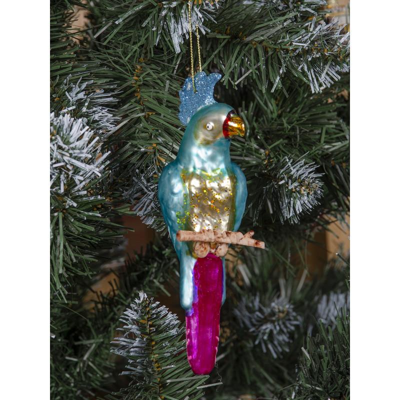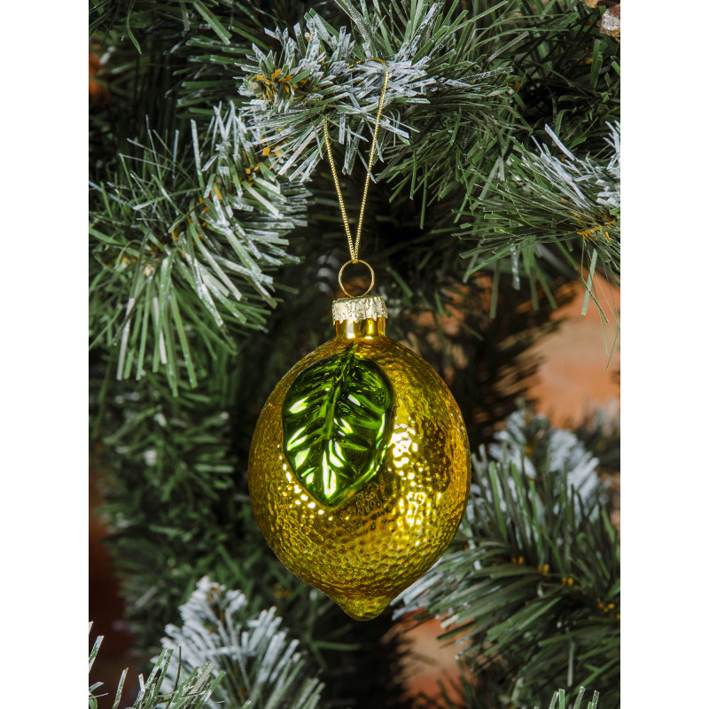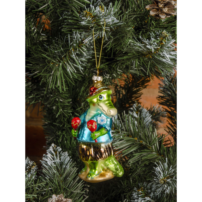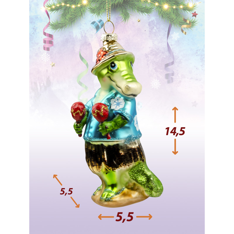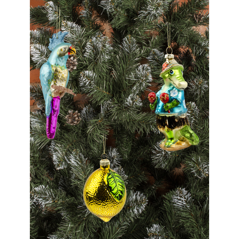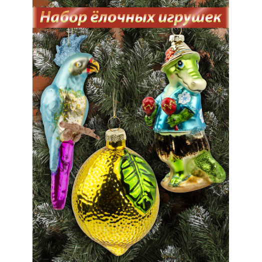 В наборе собраны елочные игрушки в форме крокодила с маракасами, лимончика и тропического попугая. Они