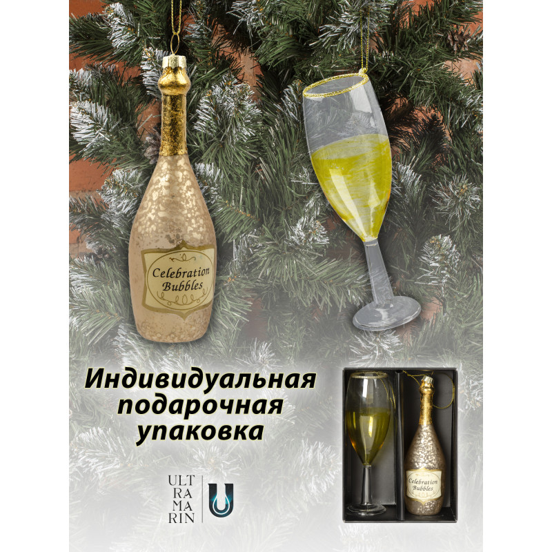 - Разнообразие форм: Каждый элемент уникален благодаря ручной работе. В наборе представлены блестящая бутылочка и бокал.