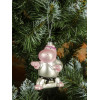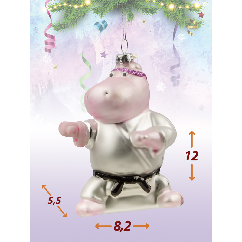 Милый розовый бегемотик с повязкой из фиолетовых страз на голове и белом кимоно с черным поясом станет отличным акцентом на вашей ёлке. Дополнительный материл элементов игрушки - полистоун. Украшение создаст особое настроение. Размер игрушки 12*8.2 см.