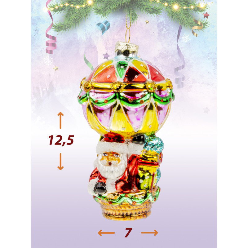 Смелый Дед мороз, летящий на воздушном шаре с горой подарков, станет отличным акцентом на вашей ёлке. Украшение создаст особое настроение. Размер игрушки 12.5*7 см.