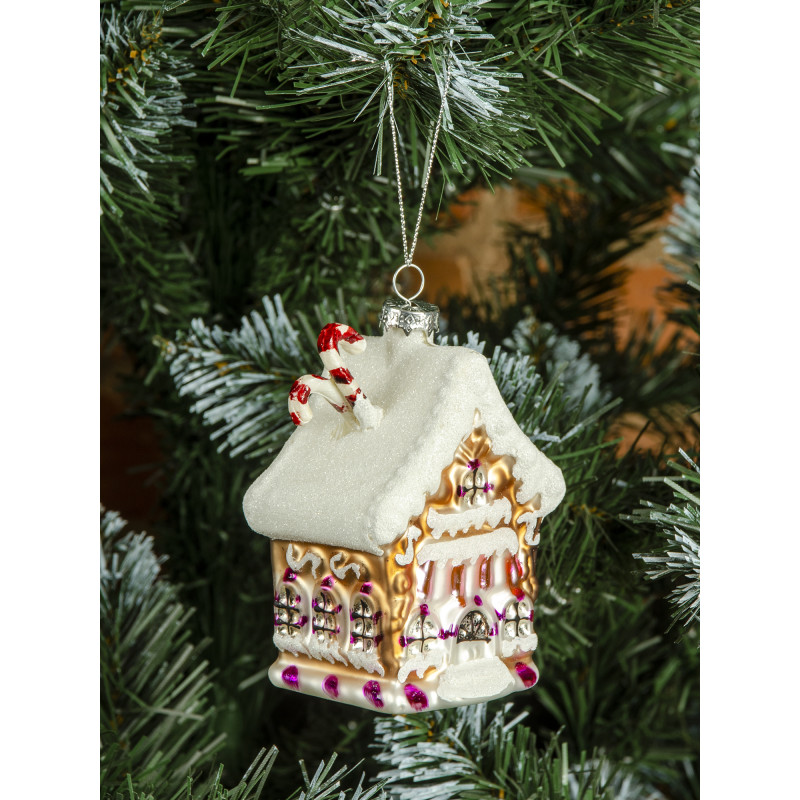 Пряничный домик с белой крышей, припорошенной серебряными блестками, и леденцами на крыше станет отличным акцентом на вашей ёлке. Украшение создаст особое настроение. Размер игрушки 13.5*10.5 см.