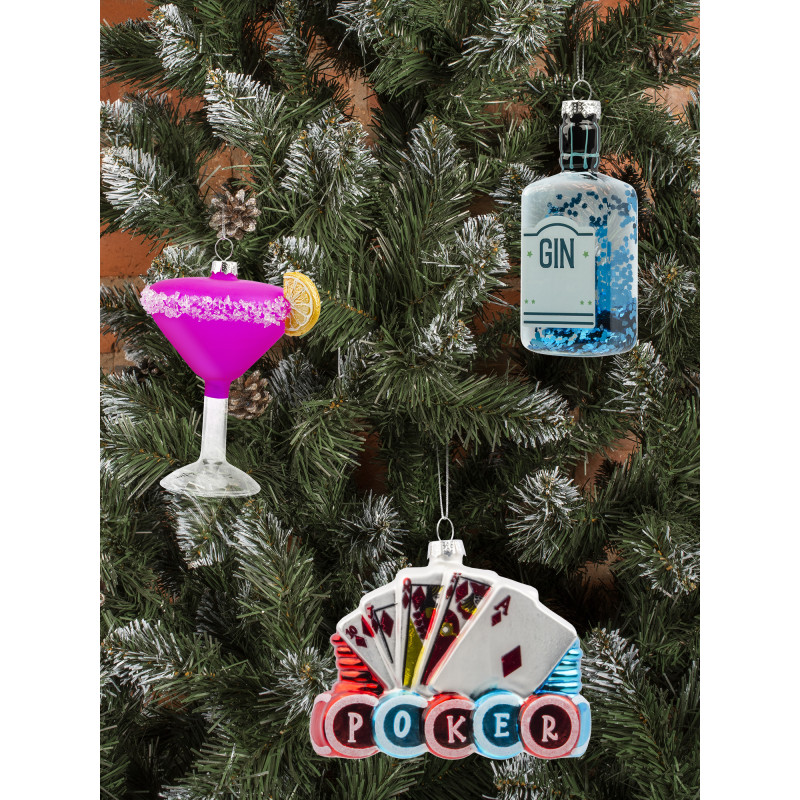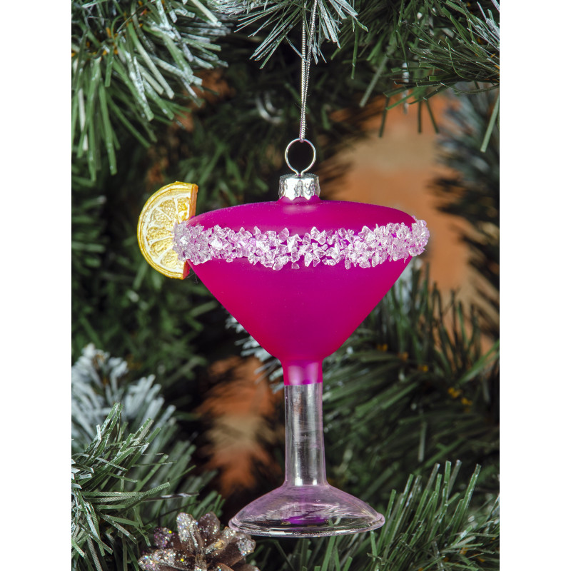 Прозрачный бокал, наполненный доверху коктейлем фиолетового цвета, украшенный долькой лимона и каемкой из прозрачных кристаллов станет отличным акцентом на вашей ёлке. Украшение создаст особое настроение. Размер игрушки 12*7.5 см.