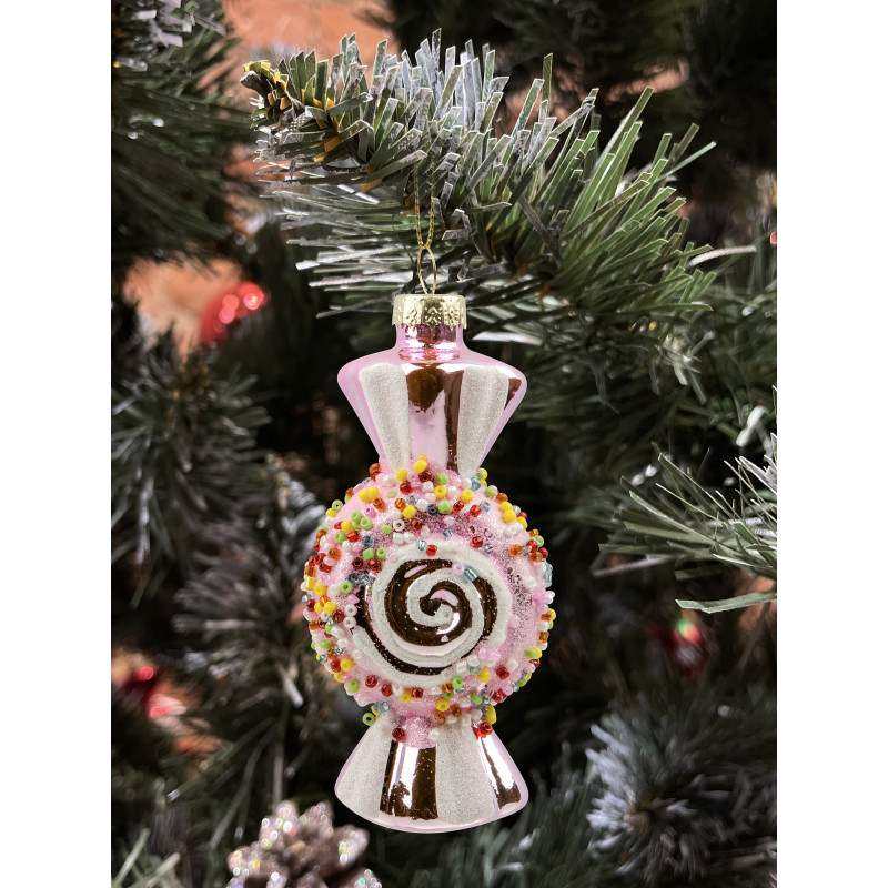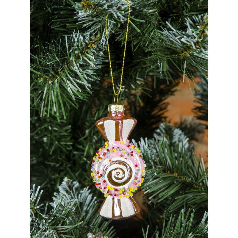 Конфетка в розово-белой упаковке, усыпанная разноцветным бисером и украшенная блестками, станет отличным акцентом на вашей ёлке. Украшение создаст особое настроение. Размер игрушки 10.4*5 см.