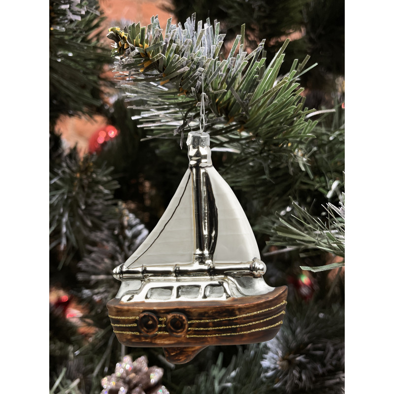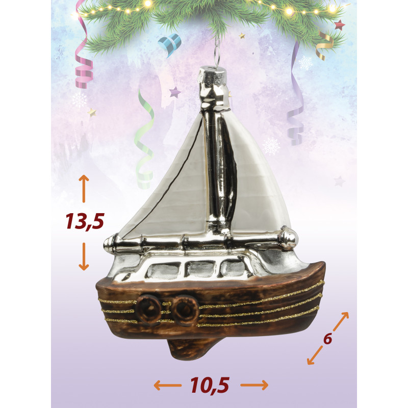 Корабль с коричневой кормой и серебристыми парусами станет отличным акцентом на вашей ёлке. Украшение создаст особое настроение. Размер игрушки 13.5*10.5 см.