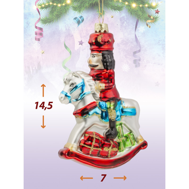 Щелкунчик на лошадке-качалке, мчащиеся разносить подарки, станет отличным акцентом на вашей ёлке. Украшение создаст особое настроение. Размер игрушки 14.5*7 см.