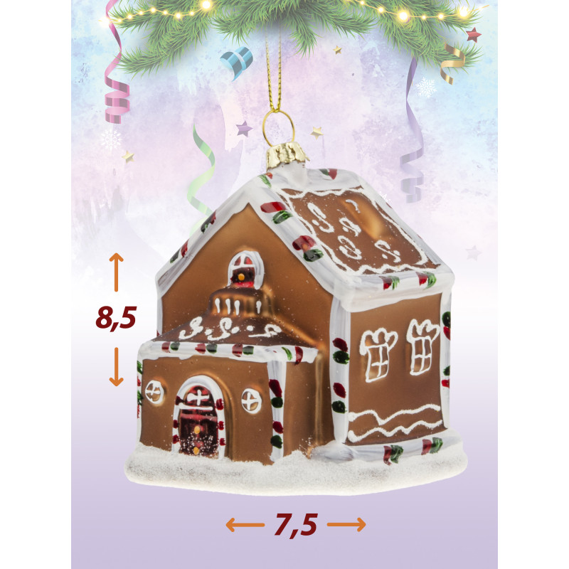 Домик с пряничными стенами и кремовым украшением станет отличным акцентом на вашей ёлке. Украшение создаст особое настроение. Размер игрушки 8.5*7.5 см.