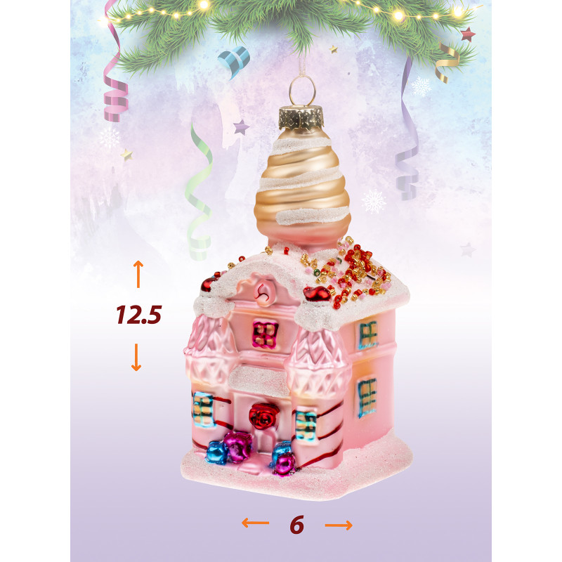 Красивый розовый домик с рожком на крыше станет отличным акцентом на вашей ёлке. Его сказочный внешний вид создаст особое настроение. Размер игрушки 7.5*8 см.