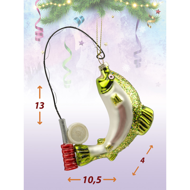 Большая рыбка с зеленой чешуей и белым тельцем, будто пойманная на крючок удочки, станет отличным акцентом на вашей ёлке. Дополнительный материл элементов игрушки - полистоун. Украшение создаст особое настроение. Размер игрушки 13*10.5 см.