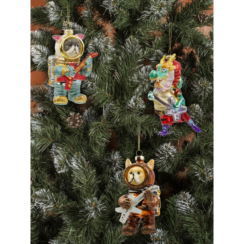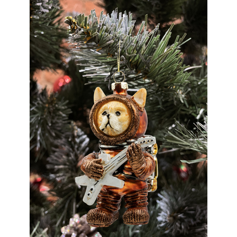 Собака-космонавт в коричневом скафандре и электро-гитарой в руках станет отличным акцентом на вашей ёлке. Дополнительный материл элементов игрушки - полистоун. Украшение создаст особое настроение. Размер игрушки 13*8 см.
