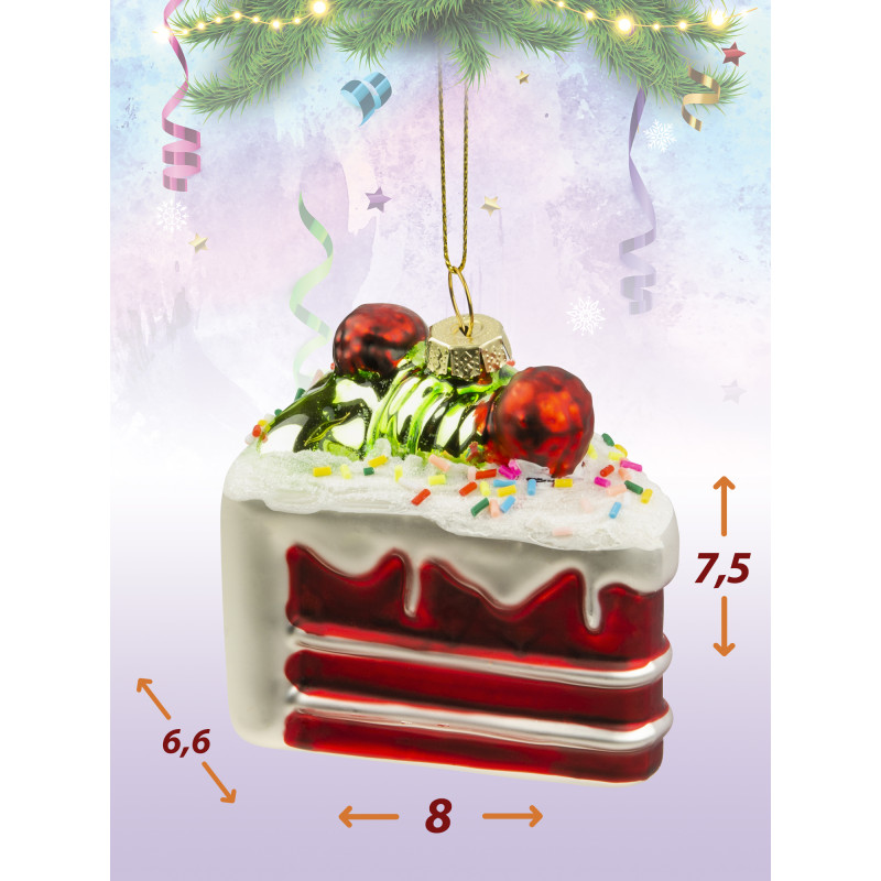 Кусочек торта с малиновыми коржами, залитый белым кремом снаружи, с кусочками ягод и разноцветной посыпкой сверху станет отличным акцентом на вашей ёлке. Украшение создаст особое настроение. Размер игрушки 8*7.5 см.