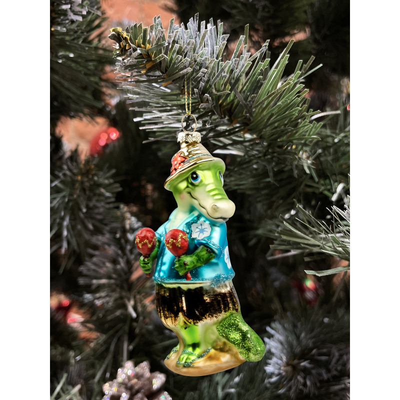 Веселый крокодил, одетый как на гавайской вечеринке: шляпа, гавайская юбка, голубая рубашка, и с маракасами в руках станет отличным акцентом на вашей ёлке. Дополнительный материл элементов игрушки - полистоун. Украшение создаст особое настроение. Размер игрушки 14.5*5.5 см.