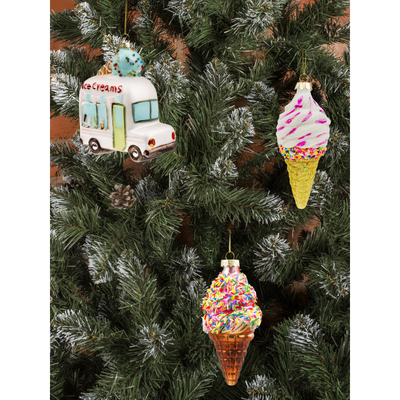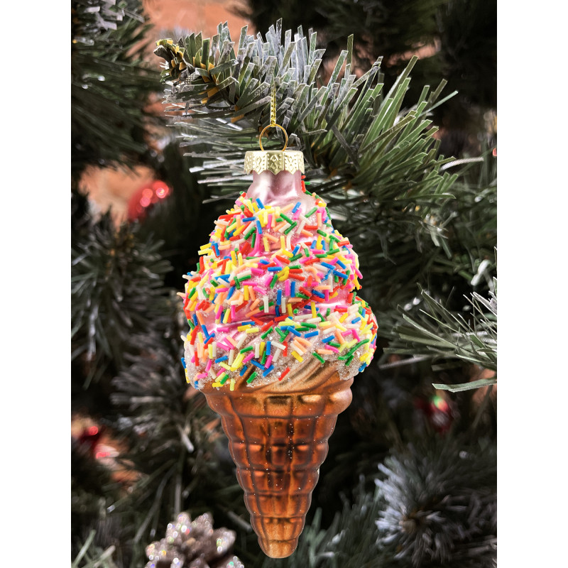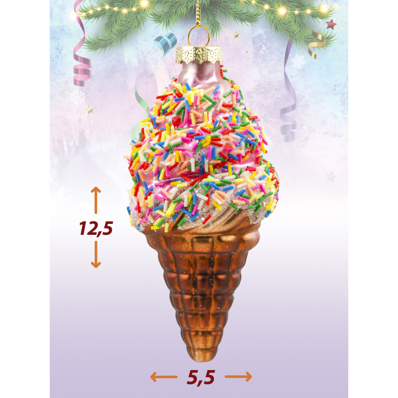 Мороженое в рожке с кремом крем-брюле и большим количеством разноцветной посыпки станет отличным акцентом на вашей ёлке. Украшение создаст особое настроение. Размер игрушки 12.5*5.5 см.