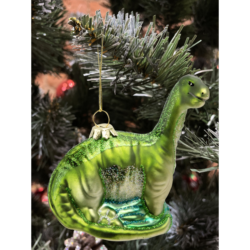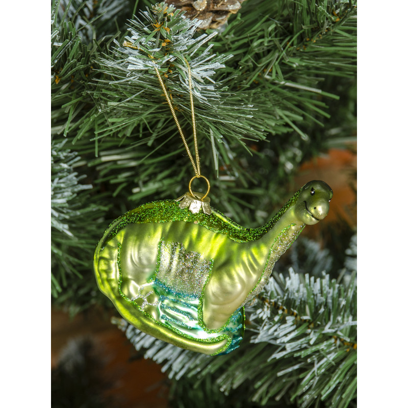 Зеленый травоядный динозавр с декором из зеленых и серебристых блесток станет отличным акцентом на вашей ёлке. Украшение создаст особое настроение. Размер игрушки 9.8*8 см.