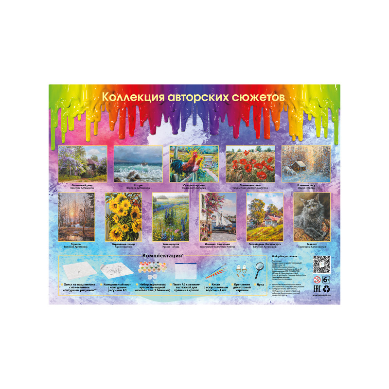 В набор входят комплектующие из высококачественных материалов, что делает их экологически безопасными. Холст из 100% хлопка, деревянный подрамник, акриловые краски на водной основе, кисти с искусственным ворсом – все необходимое для создания картины входит в комплект. Чтобы сверится с наиболее кропотливыми участками, используйте контрольный лист формата А3 и увеличительную лупу в комплекте.