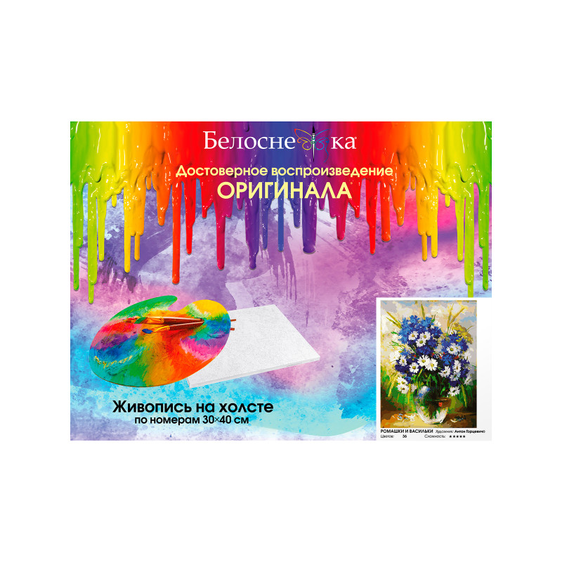 В набор входят качественные акриловые краски на водной основе, увеличительная лупа, кисти. Номера на баночках соответствуют номерам на схеме. Картина по номерам поможет расслабиться после рабочего дня или с удовольствием провести время на выходных. Насыщенные цвета, плавные переходы без необходимости смешивания цветов – создайте настоящий шедевр своими руками!