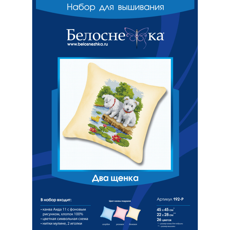 Сюжет вышивается в 3 нити полным счетным крестом и строчным стежком. Набор комплектуются качественной цветной канвой 11 СТ с обработанными от осыпания краями. Нитки для вышивания мулине из 100% хлопка, разобраны по цветам и размещены на бумажном органайзере. Также в комплект входит оборотная сторона наволочки голубого цвета, выполнена из х/б ткани со вшитой молнией. Схема четкая с контрастными обозначениями, напечатана на мелованной бумаге. На упаковке дана вся необходимая информация: фактический размер вышитой картины, количество крестиков и цветов мулине, автор сюжета и дизайнер схемы.